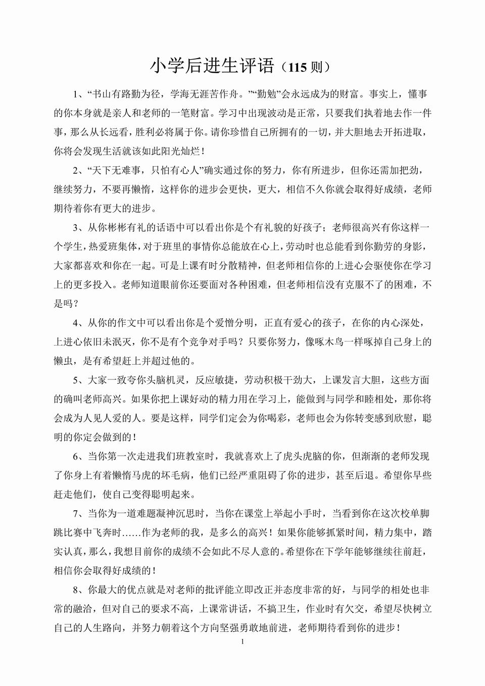 10、古往今来,大凡出名的人哪一个不是跟“勤”字有关,大科学家爱因斯坦也曾说过,天才出于百分之九十九的汗水加百分之一的天赋,可见,成功的喜悦是辛勤的汗水浇灌出的,而懒惰的人大多一事无成。你身上最大的毛病是什么–“懒”。“懒”使你迷失了学习的方向;“懒”使你染上了许多坏习气;“懒”使你丧气了斗志;“懒”使你与成功无缘。其实,你是很聪明的孩子。你模仿力较强,记得那次班队会上,你表演得“孙悟空”,惟妙惟肖多令人记忆犹新。孩子,树立起必胜的信心,去打败你的“天敌”吧!到时,会有“奇迹”出现的。