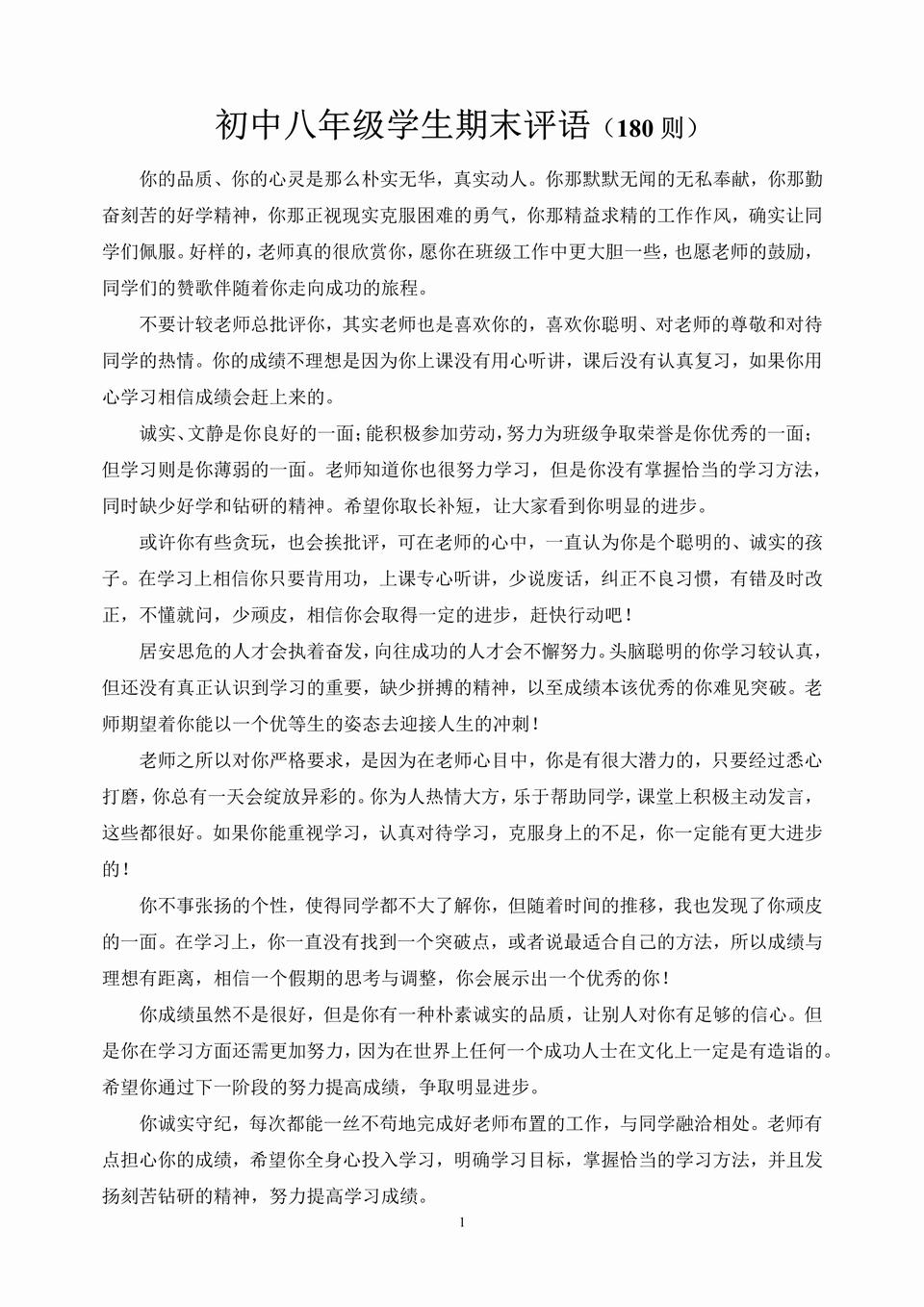 初中八年级学生期末评语(180则)
