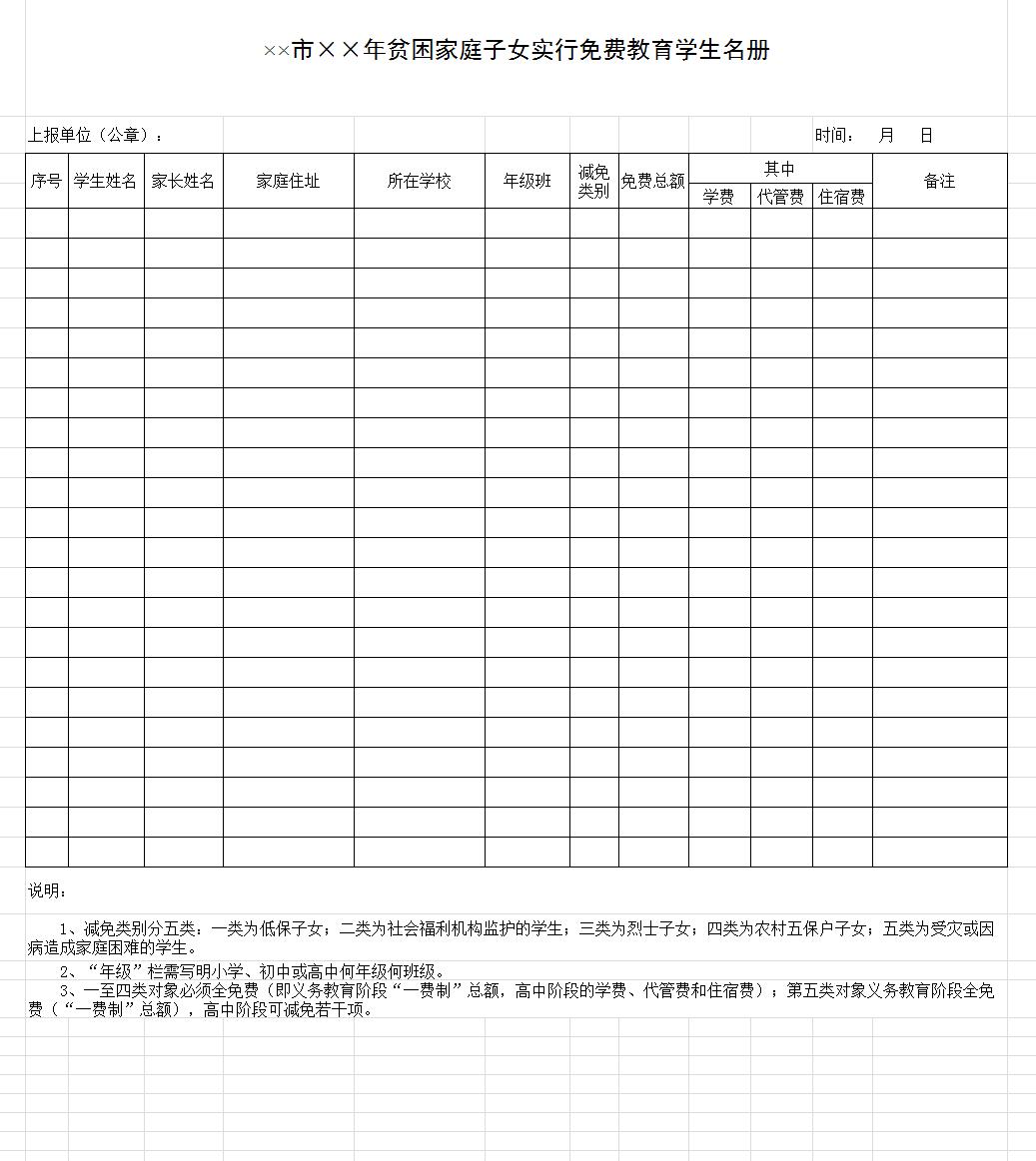 贫困家庭子女实行免费教育学生名册,贫困家庭实行免费教育学生统计表
