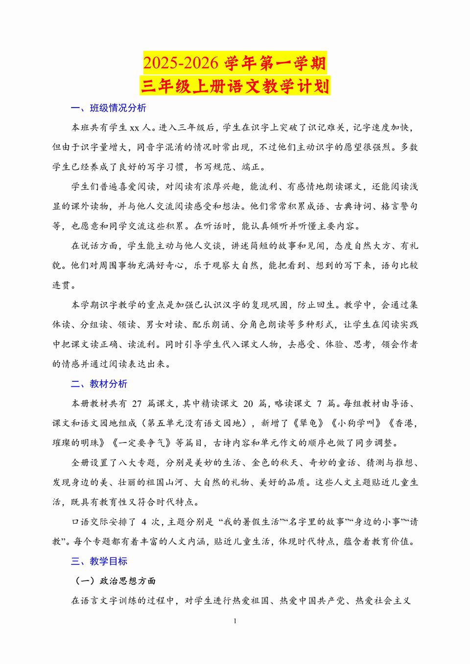 2025-2026学年秋季三年级上学期语文教学计划