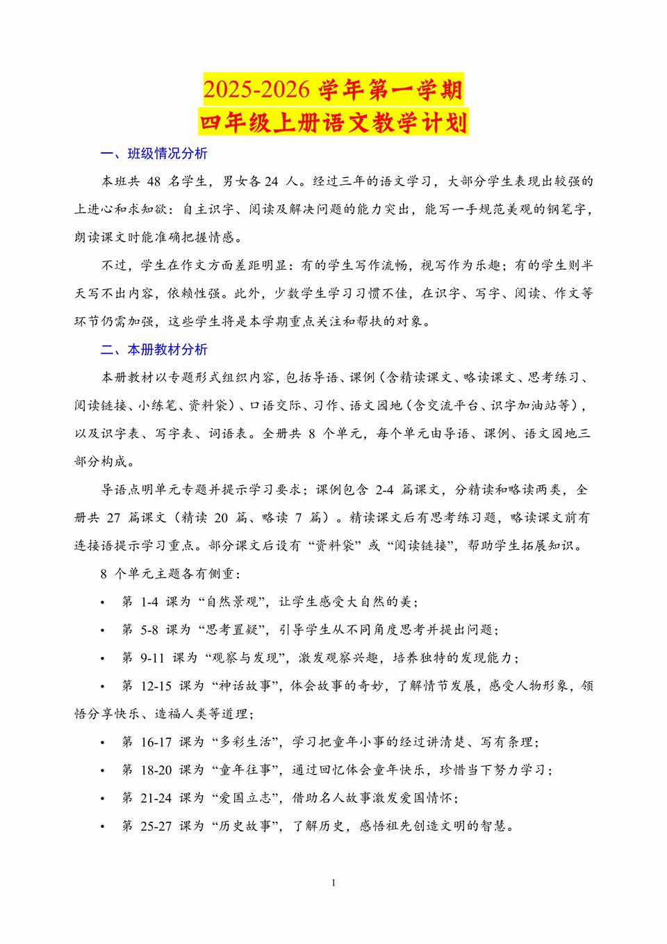 2025-2026学年秋季四年级上学期语文教学计划