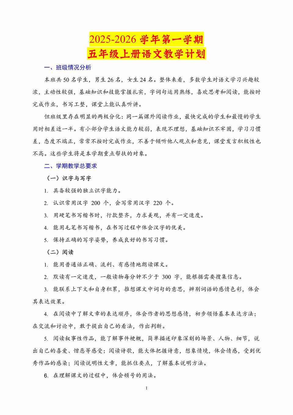 2025-2026学年秋季五年级上学期语文教学计划