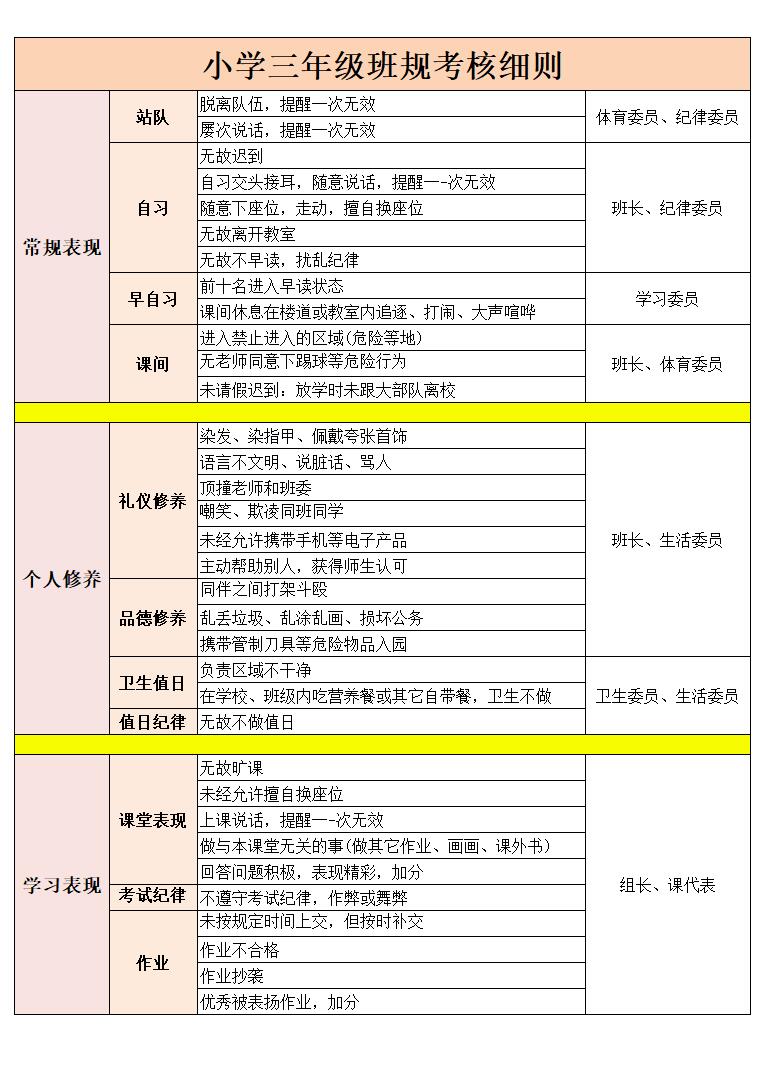 2025-2026学年第一学期小学三年级班规考核细则 站队时脱离队伍,提醒一次无效; 站队时屡次说话,提醒一次无效; 自习交头接耳,随意说话,提醒一次无效; 课间休息在楼道或教室内追逐、打闹、大声喧哗; 在学校、班级内吃营养餐或其它自带餐,卫生不做 …………