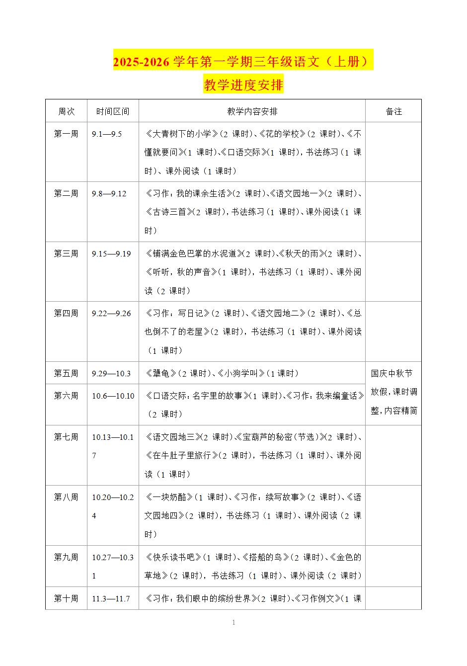 2025-2026学年秋季第一学期三年级语文上册教学进度安排