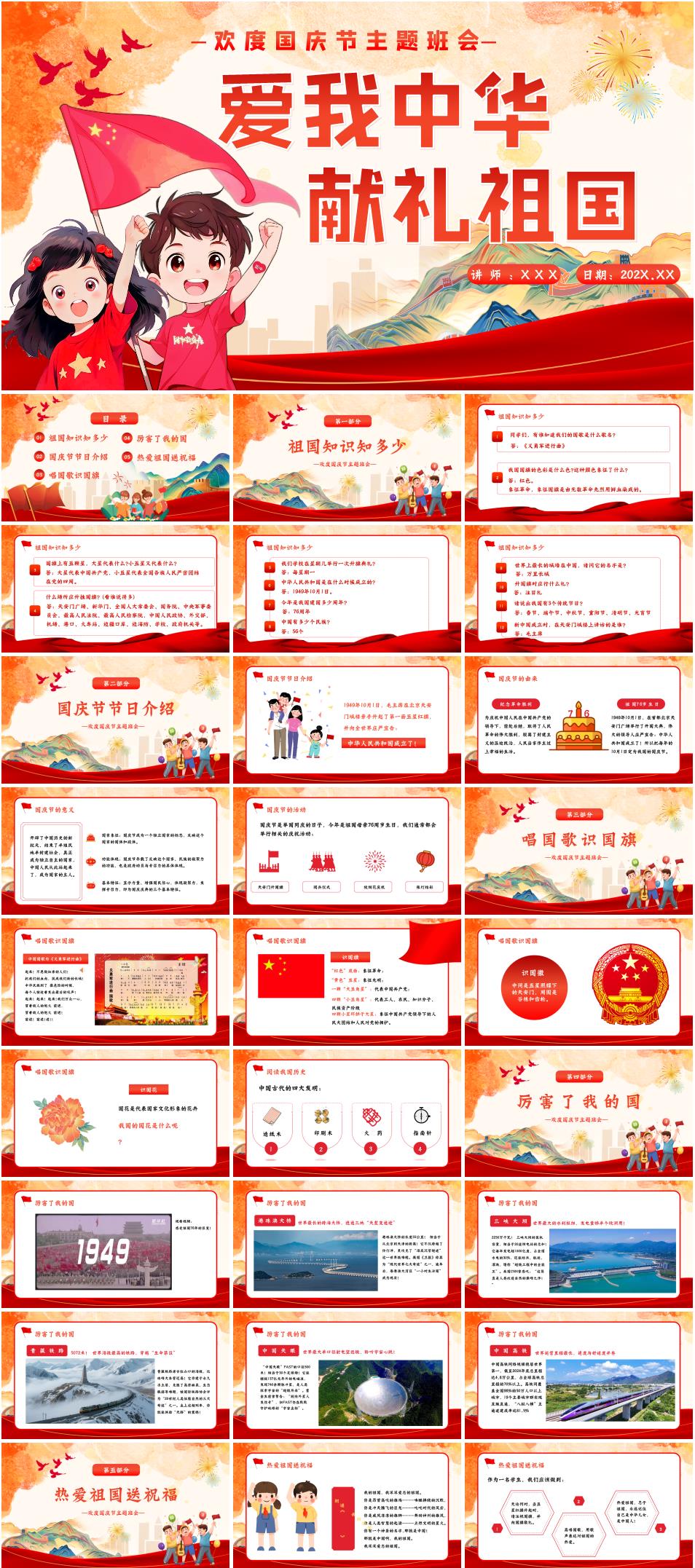 小学欢度国庆节主题班会《爱我中华,献礼祖国》PPT课件 祖国知识知多少 同学们,有谁知道我们的国歌是什么歌名? 答:《义勇军进行曲》 我国国旗的色彩是什么色?这种颜色象征了什么? 答:红色。 象征革命,象征国旗是由无数革命先烈用鲜血染成的。