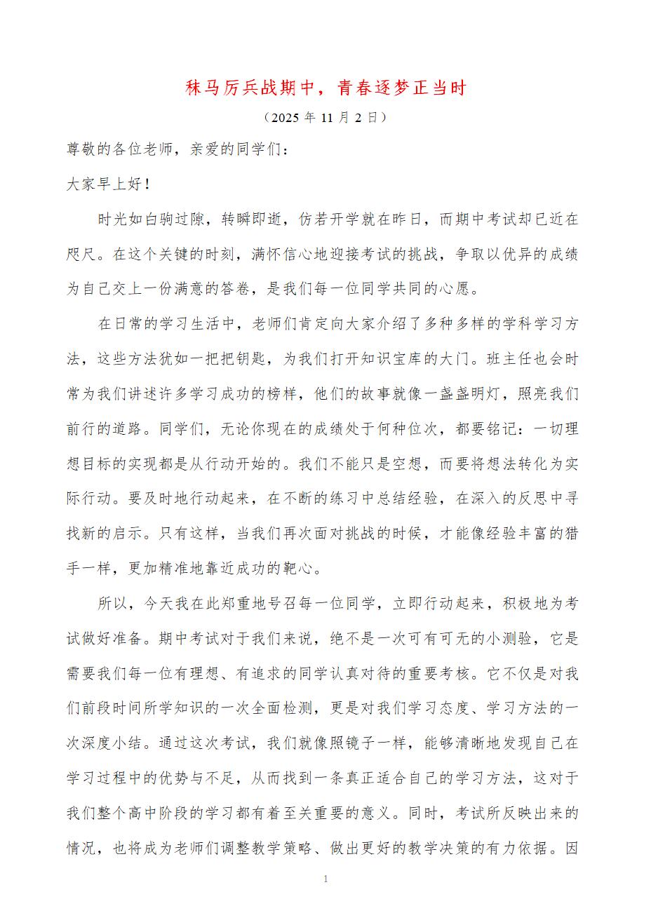 高一年级期中考试动员晨会上的讲话《秣马厉兵战期中,青春逐梦正当时》发言稿