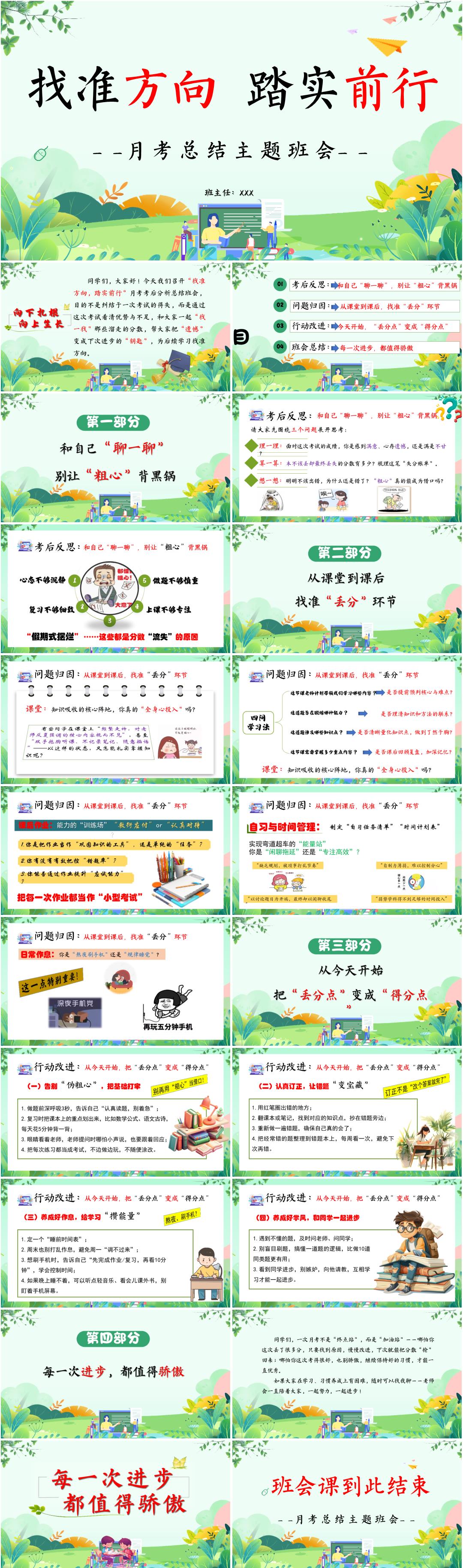 初中通用月考考后分析总结主题班会PPT课件《找准方向,踏实前行》(含发言稿)