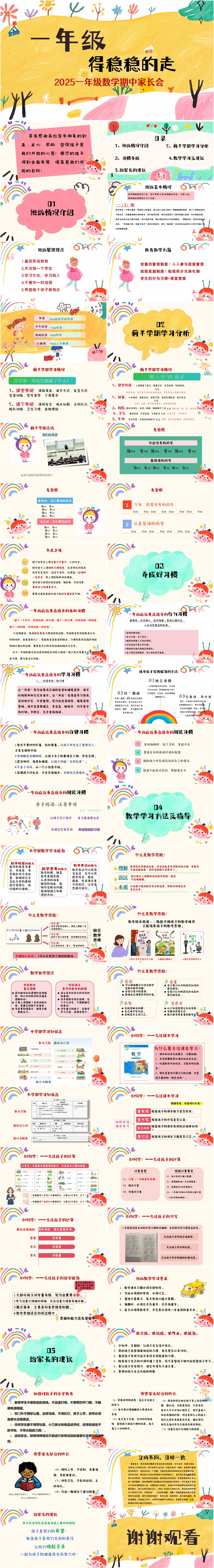 本次家长会分为5个小点进行:班级情况介绍、前半学期学习分析、习惯养成、一年级数学学习及建议、给家长的建议。