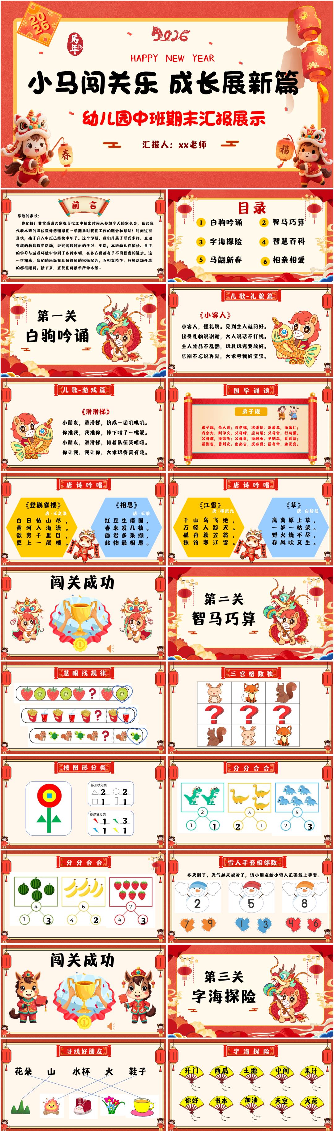 2026马年幼儿园中班上学期期末家长会成果汇报展示PPT课件《小马闯关乐,成长展新篇》(含主持稿+方案)