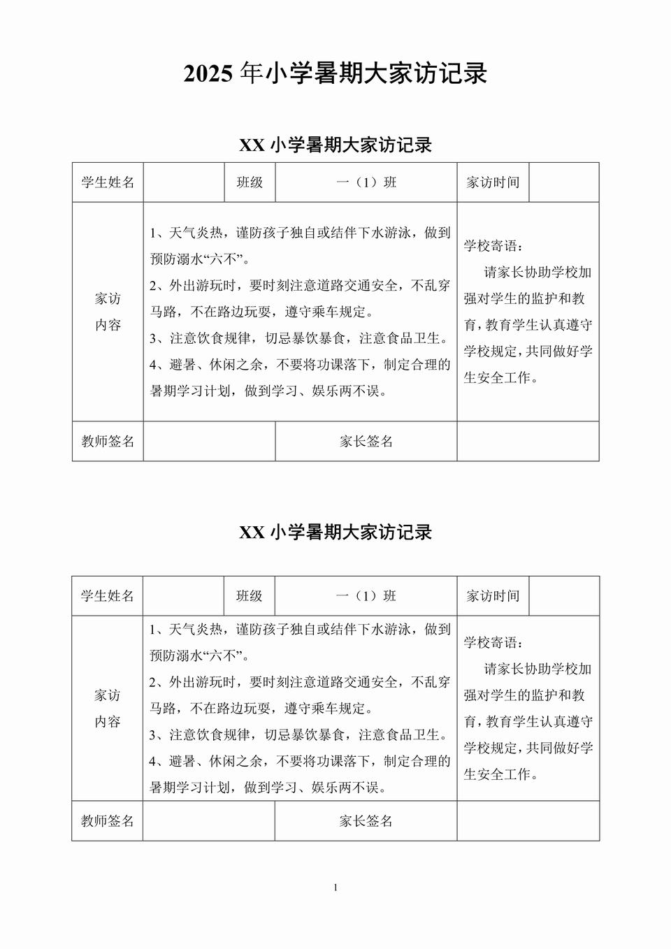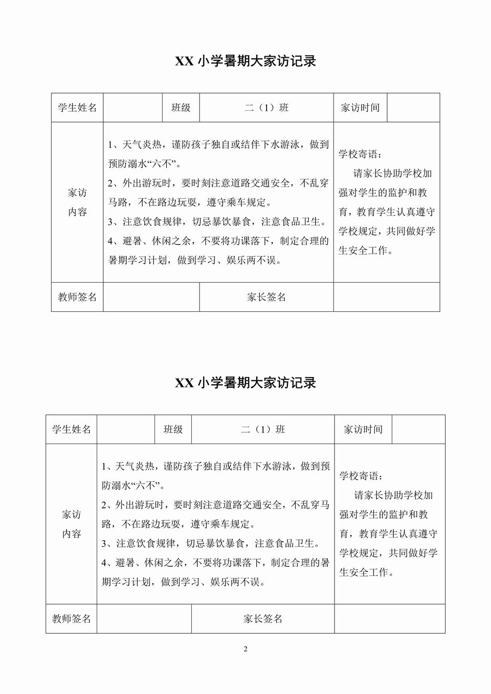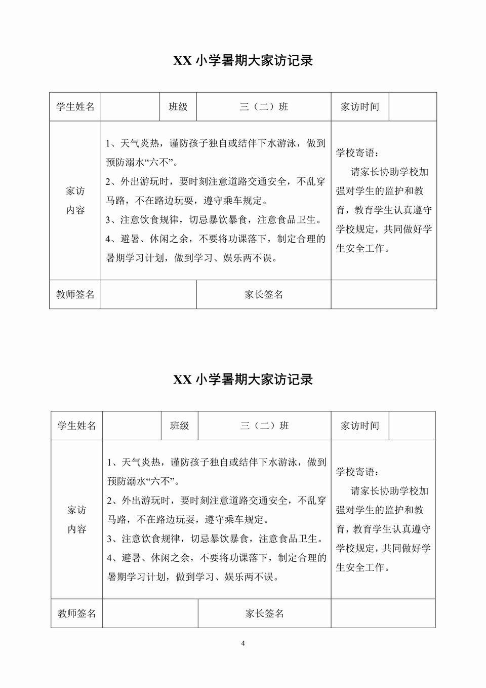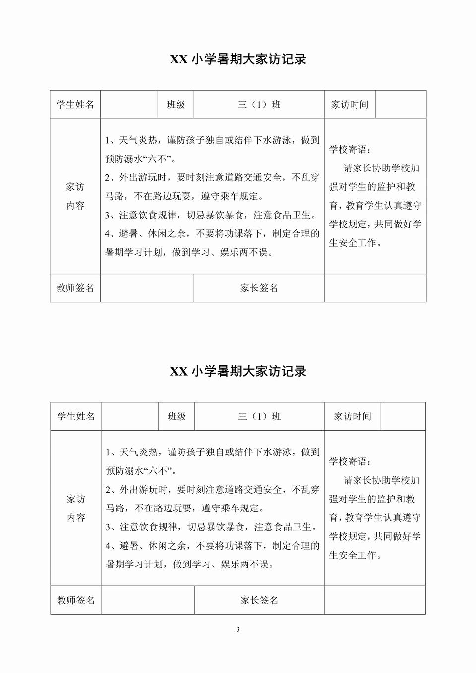 家访内容: 1、天气炎热,谨防孩子独自或结伴下水游泳,做到预防溺水“六不”。 2、外出游玩时,要时刻注意道路交通安全,不乱穿马路,不在路边玩耍,遵守乘车规定。 3、注意饮食规律,切忌暴饮暴食,注意食品卫生。 4、避暑、休闲之余,不要将功课落下,制定合理的暑期学习计划,做到学习、娱乐两不误。 学校寄语: 请家长协助学校加强对学生的监护和教育,教育学生认真遵守学校规定,共同做好学生安全工作。 …………