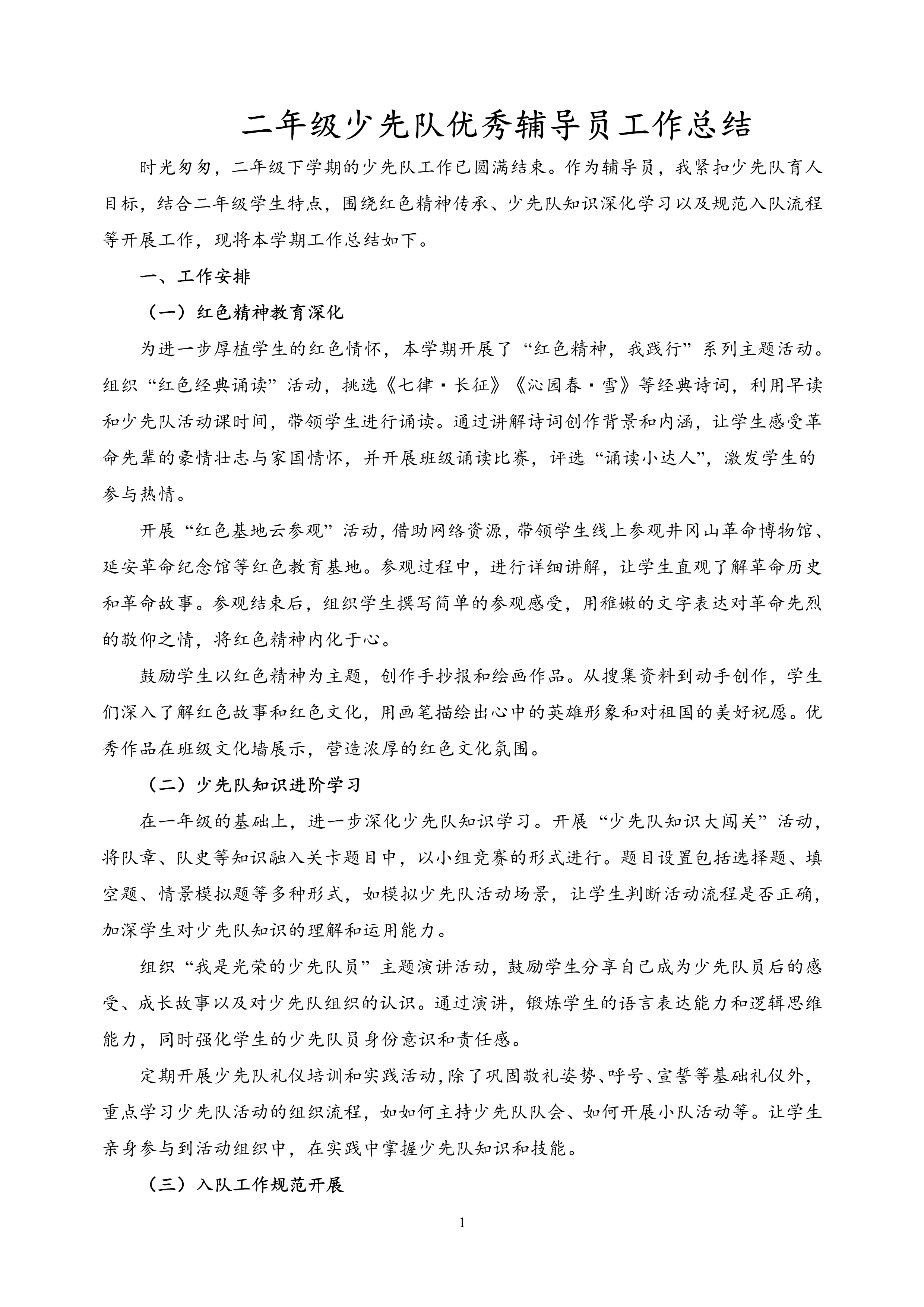 时光匆匆,二年级下学期的少先队工作已圆满结束。作为辅导员,我紧扣少先队育人目标,结合二年级学生特点,围绕红色精神传承、少先队知识深化学习以及规范入队流程等开展工作,现将本学期工作总结如下。